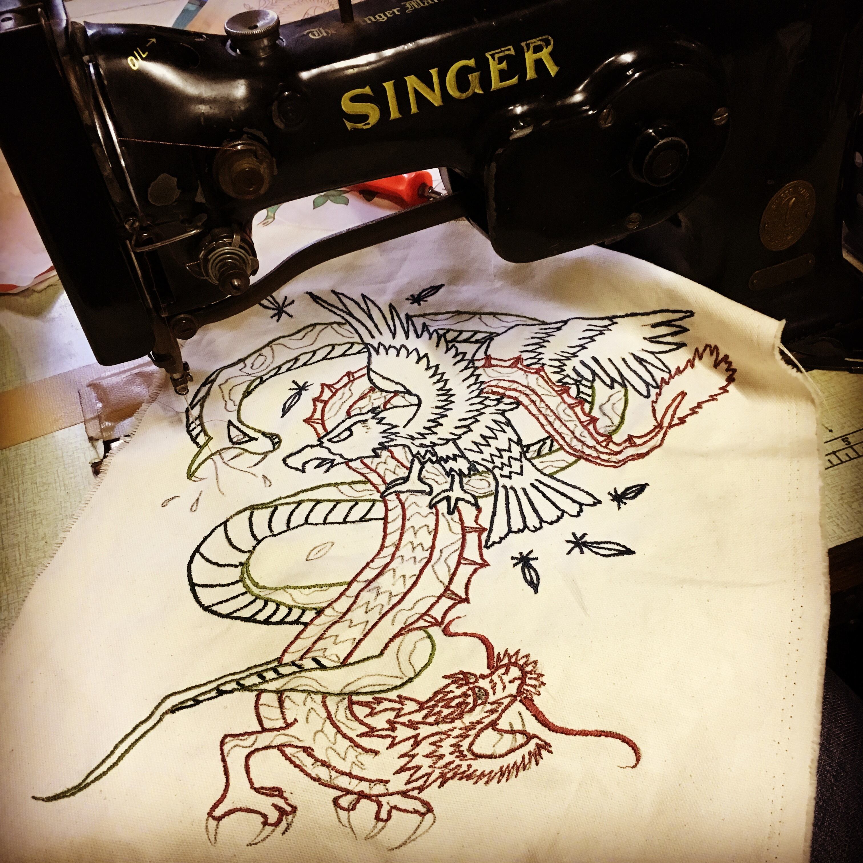 タトゥーデザインをビンテージの刺繍ミシンで刺繍 大きなフレームに 刺繍、フレームともにオールハンドメイドです。サイズ57x47cm